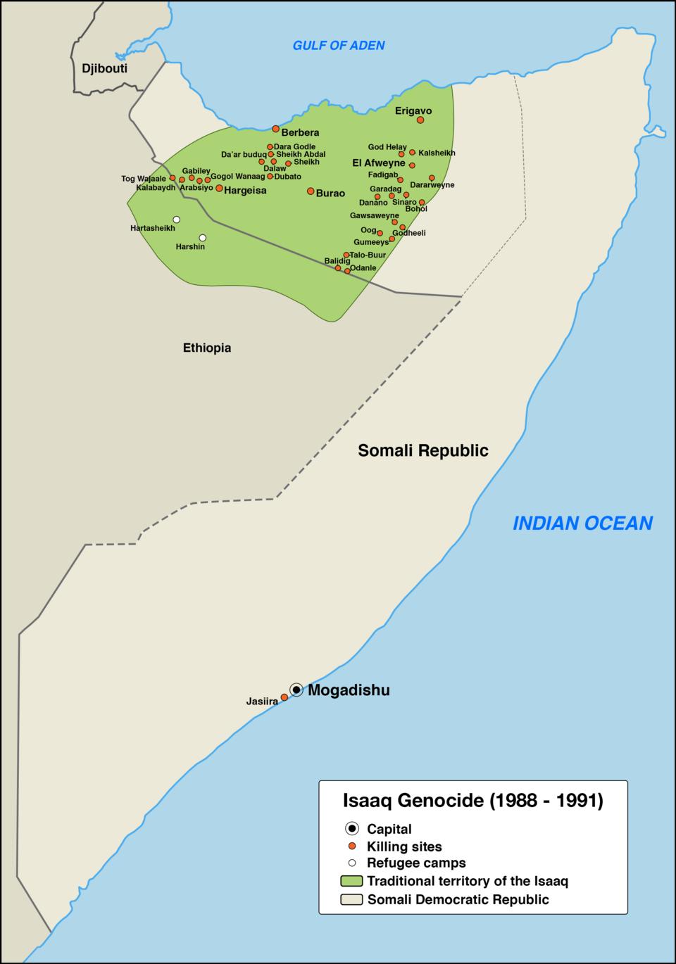 Entre 1987 et 1989 a eut lieux sur le territoire de l’actuel Somaliland, le génocide des Issaq, le clan majoritaire de la région. Il fut organisé par le dictateur de la Somalie : Siad Barre. Ce génocide est souvent nommé l’Holocauste d’Hargeisa, suite à la destruction de plus de 90 % d’Hargeisa, qui était alors la deuxième plus grande ville de Somalie.